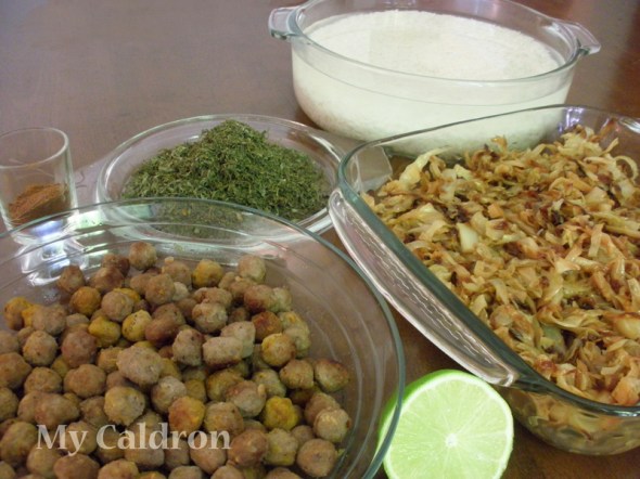 2. Heat half the oil in a frying pan and prepare piaz daagh with 2 of the onions, but don’t make it crunchy. Just sauté the onion until golden. Remove it to a bowl. In the same pan, sauté the shredded cabbage over medium heat until wilted. Then, add pinch of salt, pepper, aab-ghooreh and 1 tbs. water OR 4 tbsp sour orange juice. Cover with a lit. Steam cook for half an hour. Once ready, remove to the same bowl with fried onion.
