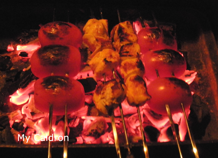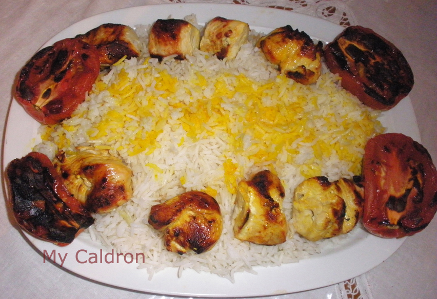 To start, here is our version of “joojeh kabaab” with rice. Basically, the difference between kebab (which, as a verb means cooking on fire) with grilled is that in kebab, we skewer meat, instead of putting them on grill – a delicate culinary point, taste-wise. Joojeh kabaab traditional way is never marinated; the tenderness of the meat has to do with the age of the chicken: it should be young, a joojeh. So, like many other mixed trades we have acquired as a result of living abroad as Iranians, here are how we make joojeh kebab, very simple: marinate the breast in grated onion, salt, black pepper, lime juice, olive oil and skewer big chunks. Or marinate legs and spread them on grill. Tomatoes should go in skewers too, but other vegetables are easier to handle on grill. One way or the other, once it is on charcoal fire it is bound to be delicious. Try it with rice by the way! Next time, I will tell you about the more complicated way of preparing kabaab koobideh (with ground meat) and kabaab barg (with strips of meat or tenderloin)