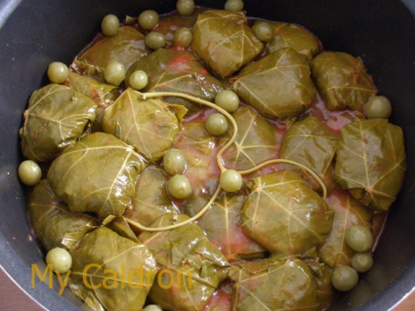 Grape dolmeh is good with gojeh sabz (green sour plums) or ghooreh (unripe grape) if you are lucky enough to have access to them; If not, well.. I decorate them with cherry tomatoes and marinated Caper berries, and they taste wonderful with dolmeh, believe me! Stuffed vegetables taste nicer when served hot, but grape leaf dolmeh is delicious cold and hot – perhaps even more delicious when it is cold, especially when served with other chasers or appetizers and nibbled with dear friends!!