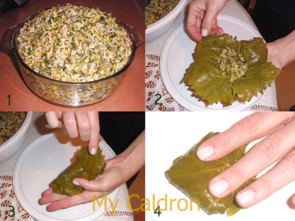 Years later, when I was living in Montreal and began to make do with preserved, bottled grape leaves, which were either old, tough and hard to cook, or easily torn because of excessive amount of preservatives used in them, one day a group of us Iranian friends came across several grapevines along one end of a schoolyard and gathered as many leaves as we could. I was so excited to try “real” dolmeh and started on it so as soon as I got home. I could not figure out why I could not fold even one single leaf without tearing it! Well, I had never paid attention to the way Mom used to prepare those fresh leaves before folding and stuffing them: By placing fresh leaves in a large container full of hot water and waiting a few minutes until the bright green of leaves change to olive green. That I learned later and put into good practice whenever I came across fresh leaves. Most of the times, however, I have to use the less desirable bottled leaves. And this is how I do it: