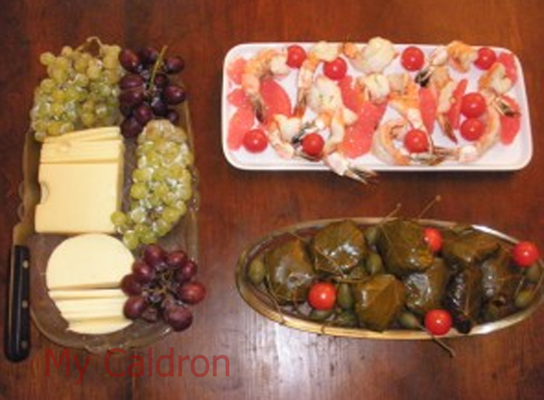 Grape dolmeh is good with gojeh sabz (green sour plums) or ghooreh (unripe grape) if you are lucky enough to have access to them; If not, well.. I decorate them with cherry tomatoes and marinated Caper berries, and they taste wonderful with dolmeh, believe me! Stuffed vegetables taste nicer when served hot, but grape leaf dolmeh is delicious cold and hot – perhaps even more delicious when it is cold, especially when served with other chasers or appetizers and nibbled with dear friends!!