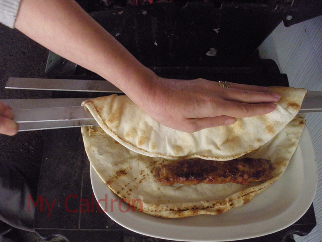 Divide your big meatball into four small ones. Then press each patty around the middle part of a skewer and shape evenly. This is difficult in the beginning but will come with practice. If the solidness is right, it will easily hold, which means if you have great difficulty making the little meat bowl stick around the skewer, it most probably will not hold over fire! Your kebab mix should have some elasticity and it should not be sticking to your hands. Use a little water to moist your hand while squeezing the meat around the skewer. And don’t leave skewered kebabs for more than ten minutes.