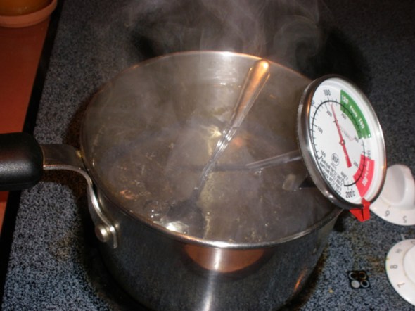 Sterilize your equipment (and do it each time you make yogurt) Fill the pot with tab water and bring to boil on high heat. Stick your spoon and thermometer in the boiling water for a few minutes. Empty the pot and let them air dry on the stove surface – completely dry!