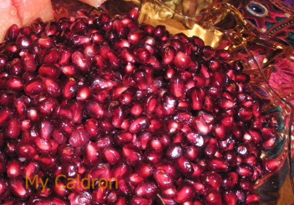 I remember quite vividly how the whole population of our crowded house back in Shiraz used to sit around big, round, copper trays in the yard under the delicate warmth of autumn sunbeams and lose track of the number of pomegranates we seeded and munched with delight. Mom kept urging us to eat more because it “cleansed our blood.” Indeed, pomegranate juice, sold in every street corner for a good portion of the year, was believed to be a miraculous remedy for a wide range of illnesses. When I found out that pomegranate was in fact a strong antioxidant, I did not have access to it anymore, save once a year at winter solstice when all Iranian stores imported California pomegranate as part of our celebration of “Yalda”. For the past couple of years however, major supermarkets in Montreal are increasingly selling this marvellous fruit and I am delighted to have them handy once again. You should try it if you have not already, just look for plump, cut-and-bruise-free ones that feel heavy for their size.