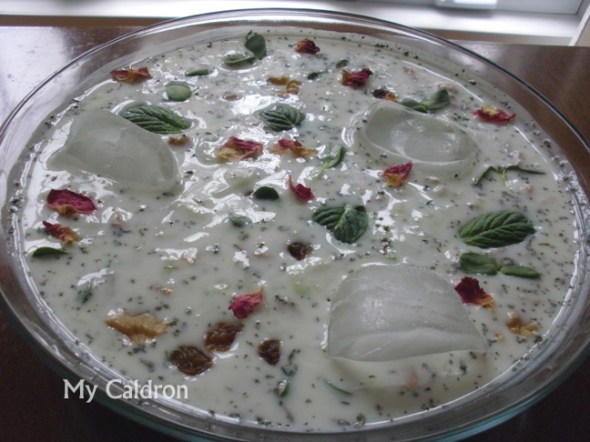 One last thing, this particular invention of my friend is inspired by something we call “aab-doogh-khiyar” in Persian (which means, water-doogh, cucumber). This thing, in turn, is a combination of two summer favorites: doogh, and grated cucumbers in plain yogurt. The later is very popular as a chaser and side dish. Our jewled yogurt mix is some kind of glorified aab-doogh-khiyar I would say! 🙂