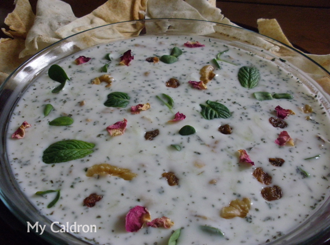 Method: in a large kitchen bowl, first beat yogurt till soft. Add salt, pepper, dried mint and stir. Add grated cucumber and onion and dilute the mix with water and stir more. Add about 90% of dried raisins and chopped walnuts (keeping the rest for the topping). Taste to adjust. Transfer to a nice, transparent) bowl, and sprinkle some greens and reds on the top: fresh mint, basil and dried rose, as well as the rest of your raisins and walnuts. Now, this could be your yogurt mix on its own, or it could be the base of it, depending on how you feel (see pictures below). For a more stomach-filling dish, add toasted bread pieces and wait until they are soaked a bit, but not too mushy before eating. Or if you prefer a cool refreshing fancy drink, simply add a few ice cubes. You would need more water in your initial recipe, if you are going with the bread variation, and less water if you are going to add ice at the end.