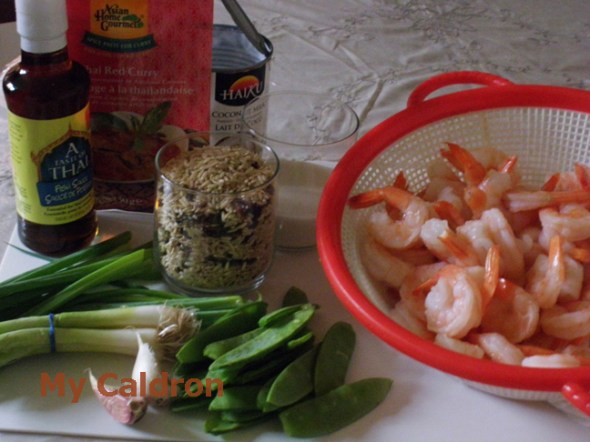 Method: Heat the oil in a large frying pan over -high heat. Add the white parts of the green onion and red curry paste and fry for two minute. Add the garlic, shrimp, and peas, and continue frying for another 4 minutes. Add the coconut milk and fish sauce, and mix thoroughly. Simmer mixture for 2 to 3 minutes, or until shrimp is firm. Remove from heat, and add the remaining green onion and the cilantro. Serve over brown or white rice.