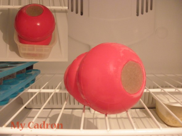 Popsicle for us, what about dogs? I have this delicious, clever thing made of Kong and frozen broth – thanks to my dog’s trainer! So easy to make, you just need to give it 7-8 freezing time. Take a KONG (appropriate to your dog’s size). Using a dab of peanut butter or cooked meat, seal the smaller hole, then turn it upside down and place it in a small bowl and fill the KONG with chicken broth. You could throw in bits of treat to make it more exciting for your dog. Place the bowl / KONG in the freezer overnight, or long enough to make the liquid completely hard.