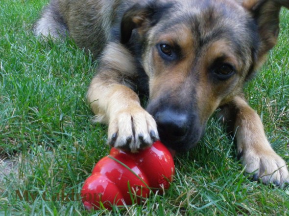 It takes my German Shepherded mix about 45 minutes nibbling and licking at the both ends of the KONG, occasionally throwing it up in the air and smashing it against the floor – all in the hope of having the thing out a bit faster. In the end, he takes the frozen broth all out, without letting a drop of the liquid on the floor! 🙂