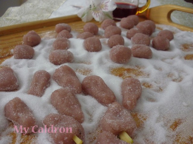 Now start working with the other half of your paste – the one you set aside. Add 2-3 tbsp. of raspberry juice to make the paste soft enough to be rolled, while having and fairly reddish color to it. Follow the rest of the procedure as above.