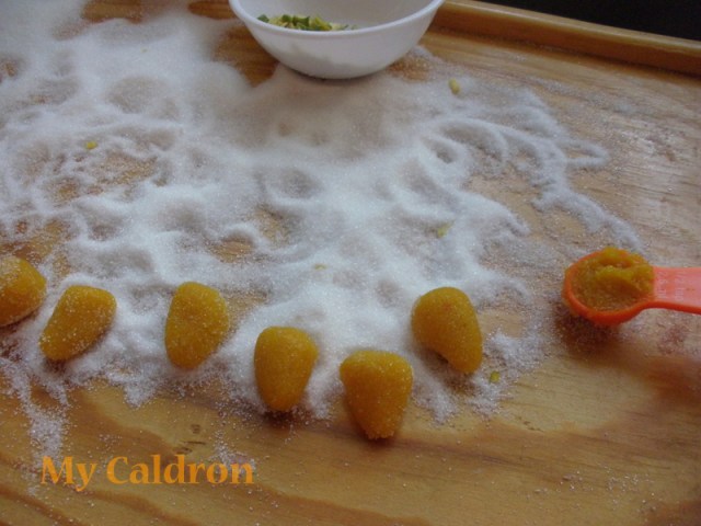 Cover the surface of a platter with sugar. Take a small piece from your big ball of the paste and roll into small Mulberry shaped bites. I used a 1/2 teaspoon to make them in equal size. Dip each toot in the sugar, covering all sides. Finally, Place a silvered pistachio on top of each Toot.  Make sure to keep toot in a sealed jar as they would get dry quickly when exposed.