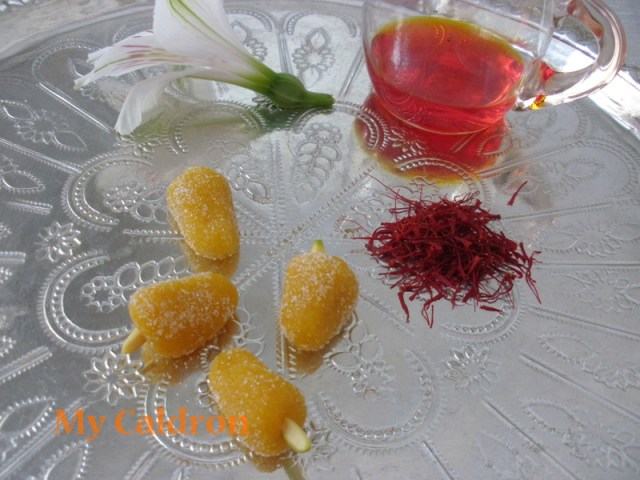 To make Almond Toot: In a bowl, combine ground almond and icing sugar using the back of a fork or your fingers. Gradually, add the rosewater and mix the ingredients into a sticky semi-soft paste. Divide the paste into two and set aside the first half in a covered container. Add 1 tbsp. saffron to the second half of the paste and make a soft paste (add more rosewater if necessary) You need the paste to be soft enough to form small balls.