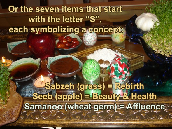 At the core of the festivity stands Norooz table setting, with specific items arranged in it, including the famous “haft-sin” or the seven items that start with the letter “S” in Persian, each symbolizing a concept: