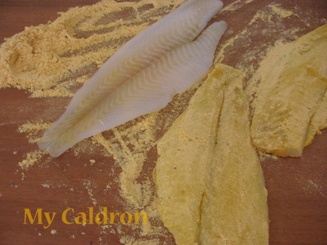 If you are using frozen fish, defrost completely in cold water. Rinse under cold water and pat dry. It is very important that the fish is completely dry; otherwise it will disintegrate while being fried.