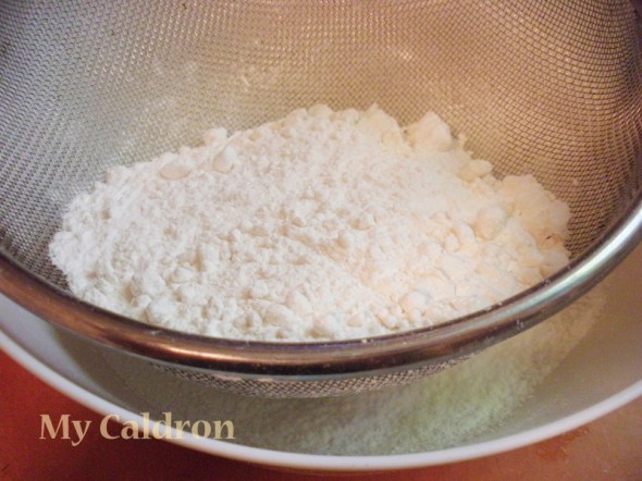 Mix and sift the flour and the corn starch twice in a bowl and put it aside. Sifting flour makes its particles space out and away from each other. This is one of the two things we must do in order to give sponge cake enough volume. The second secret in having a high volume cake is beating the eggs as described further down.