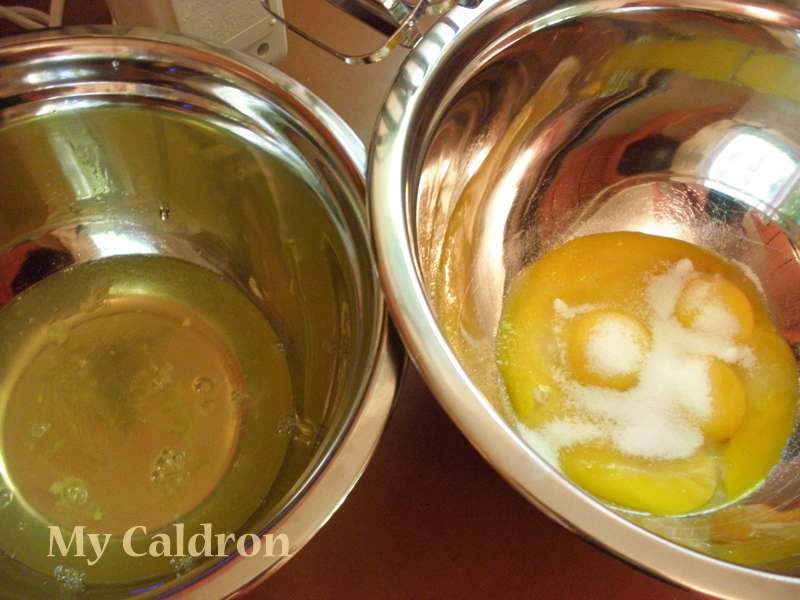 Separate eggs yolks and whites in two dry, clean bowls. Make sure there is no yolk left in white as this prevents white from whipping properly.