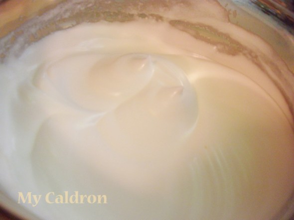 Wash and thoroughly dry the beaters. Beat egg whites on medium and then high speed until they reach “stiff peak” stage; that’s when the peak on the egg white surface and on the beater holds and if you tilt the bowl the whites slide around.