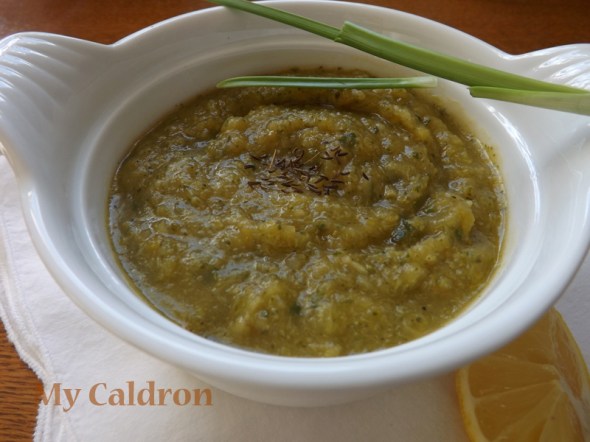 Add the following items to the blender: Cooked turnip, cauliflower, broccoli, butternut puree, spinach, olive oil and ½ glass turnip juice or chicken broth. Secure the lid and press to blend for less than a minute, or until all vegetables are mixed. Transfer the content of the blender in to a small pot and add half of your cumin + lime juice and salt and pepper. Simmer for ten minutes, taste for adjustment and sprinkle the remaining cumin on the top the serving pot to preserve the aroma. You could also garnish with green garlic.