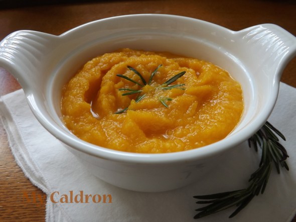 Method: Steam cook carrot. Add butternut puree, apple puree, carrot, curry powder, olive oil and chicken broth in to an electric blender. Secure the lid and press to blend for less than a minute, or until all vegetables are mixed. Transfer the content of the blender in to a small pot. Taste for adjustment and if necessary add salt and pepper. Simmer for ten minutes and add rosemary just before serving.