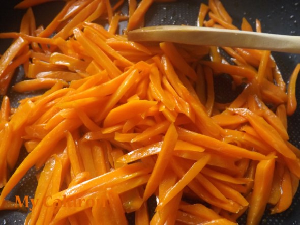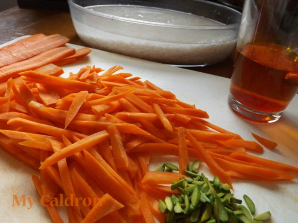 Now. After the slicing is done to your satisfaction, in a non-stick frying pan heat ½ tbsp. oil and fry sliced carrots for 3-4 minutes until they are tender. Add 1 teaspoon salt, 1 teaspoon sugar and 1 tbsp. of the dissolved saffron. Stir well and set aside
