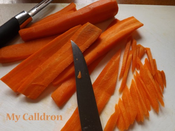 Slice carrots in small pieces, as shown in the picture; I do not recommend grating them. Here is what I did: After washing and skinning them, I chopped off the heads and tails using a cupboard and sharp knife. Then I cut each carrot lengthwise into several flat thin pieces. Then I held my Knife diagonally to cut into each piece and produce tiny slices, while doing more cutting and size adjusting as I went along