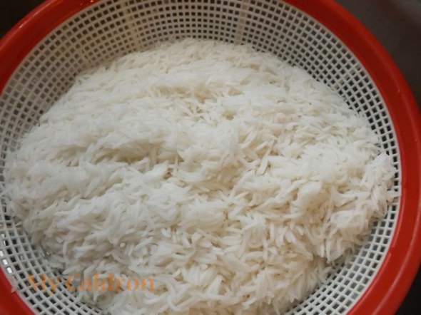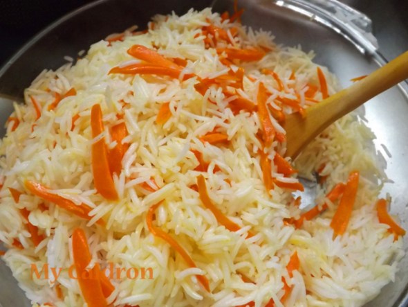 Drain the rice in a fine-meshed sieve. After a minute or two, transfer the rice in to a large bowl. Add fried carrots, along with whatever oil and saffron mix is left in the frying pan, in the bowl and gently yet thoroughly mix it with the rice. You will notice the rice changes in color a little. No need to wash the frying pan yet; we need it soon