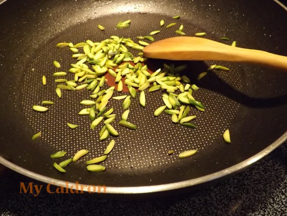 Just before serving, get your frying pan back on the stove and briefly sauté sliced pistachios