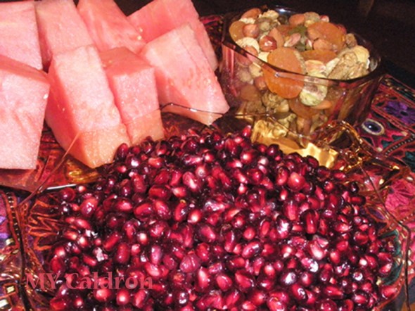 Yada is celebrated by Iranians as well as many people of Indo-Iranian origin in Afghanistan, Azerbaijan, Kurdistan, Tajikistan, Uzbekistan and Turkey with friends and family in form of a cozy “food- tale party” around a colorful table or spread or korsi topped with colorful fruits and sweets. Korsi, by the way, is an ancient Persian tradition whereby a source of heat usually charcoal burner is placed under a medium size table and the table itself is covered with a large quilt. Lots of big comfy pillows, many rounds of teas, and very cold weather are all essential parts of the korsi setting! Back to Yalda, depending on the region and city, the items on the table as well as the activities around it vary. However, there are a few constants cross regionally: Watermelon, seeded pomegranate, and dried-fruit-seeds-nuts mix (ajil) are very common food items (in shiraz, dates halva is customary; also, while generally there is no specific main dish associated with Yalda festivity, in Northern province of Gillan white fish is served on Yalda night