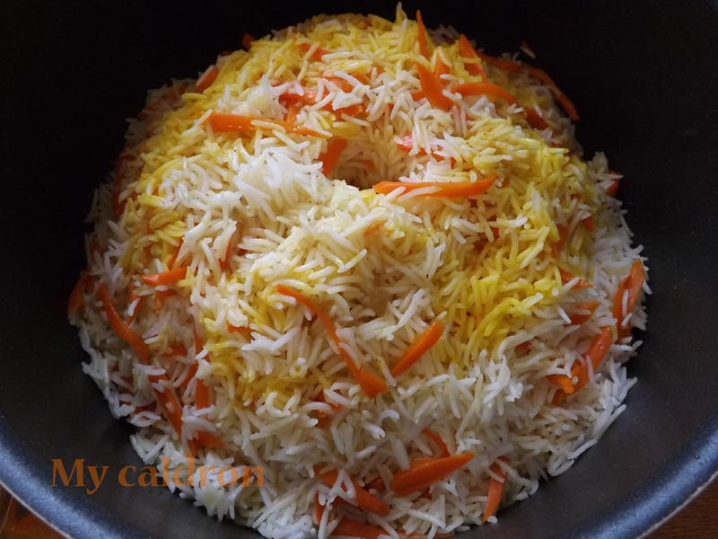 Drain the rice in a fine-meshed sieve. After a minute or two, transfer the rice in to a large bowl. Add fried carrots, along with whatever oil and saffron mix is left in the frying pan, in the bowl and gently yet thoroughly mix it with the rice. You will notice the rice changes in color a little. No need to wash the frying pan yet; we need it soon