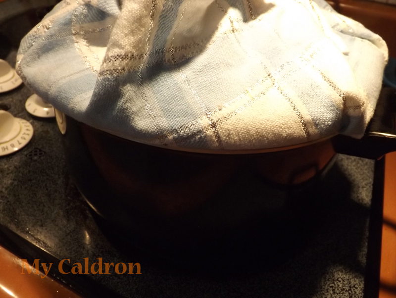 Add the remaining of diluted saffron + 1 tbsp. oil from the cooked chicken if you have any left. Cover and cook over medium for a few minutes or until you get plenty of steam inside the pot. Warp the lid in a clean kitchen towel, tightly cover reduce the heat to low and cook for 40 minutes