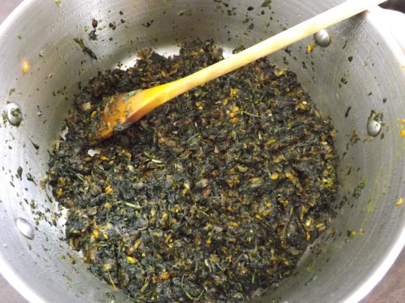 At the same time, add the garlic-chili-turmeric paste and fry for a few more minutes. The garlic component can turn bitter by over frying (so does the fenugreek). So keep it brief. Stir constantly to ensure a perfectly harmonious mix. I am taking pictures of every step to the best of my ability. I just wish there was a way I could send you the smell, OMG, the heavenly smell of this fresh garlic and fenugreek ( I think my neighbours must be going crazy right now 🙂