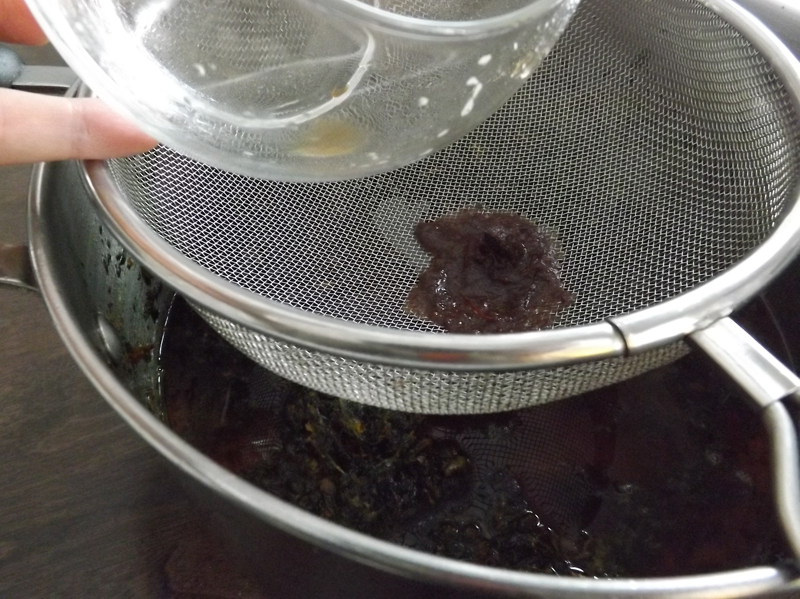 Extract the tamarind’s juice by mildly squeezing it through the colander and pouring it in the pot, adding also one glass of warm water to just top the mix inside the pot. Turn the heat down and simmer for an hour.