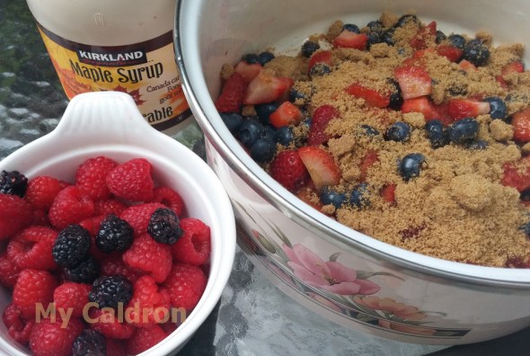 - 10 cups of Strawberries, black berries, blue berries and raspberries (in equal proportions) washed and drained. Only strawberries need cutting; keep the rest whole.