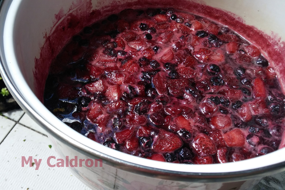Place the cut strawberries and blue berries in a not-too-deep copper or enamel pot. Sprinkle ¾ of sugar on top, close the lid, shake well and leave it in the fridge overnight. Place black berries and raspberries in a normal bowl with lid, sprinkle the remaining ¼ of sugar, shake well and leave it in the fridge. The reason we separate the berries is that the former berries are tenderer and require less cooking time.