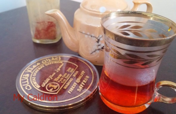First off, prepare your saffron by mixing the saffron and 2 tbsp. warm water in a small teapot and placing it on the top of a steaming kettle for 15 minutes. The idea is to bring the aroma, taste and color out by brewing the saffron, just as we do with Iranian tea.