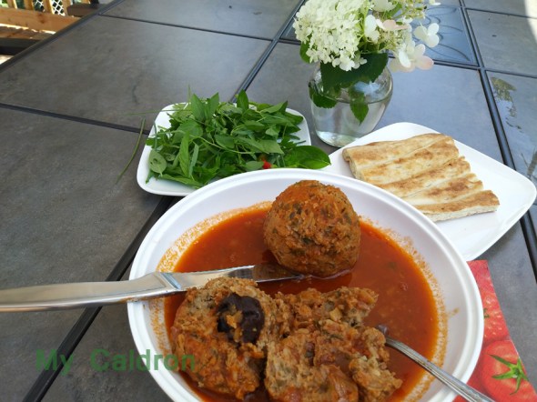 Today I want to share with you a very popular dish called Koofteh Tabrizi کوفته تبریزی – a rich yet tender meatball served in savoury thick tomato broth. As the name suggests the dish is a speciality of the city of Tabriz also known for its sophisticated and extremely delicious cuisine. Like the other two meatballs, the basis of Koofteh Tabrizi is a mix of ground meat, grated onions, chickpea flour, turmeric and pepper-salt. However, Koofteh Tabrizi is distinct in its taste as it is mixed with cooked rice and split peas as well as with aromatic fresh herbs; it is also different from other types of meatballs with regard to its fairly large size (here we go with Tennis ball size in order to better manage and make sure it will hold throughout the cooking process).