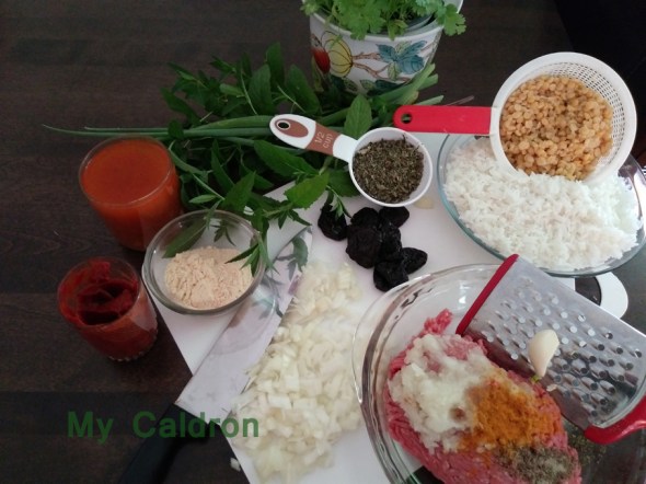 Koofteh Tabrizi, too, is made in a number of different ways in terms of size, stuffing and even main ingredients. My recipe here has been inspired by Family Spice – a wonderful resource for all foods Iranian and otherwise! I have, however, made some changes to the ingredients to suite my family’s taste (namely adding garlic and changing the stuffing from raisin to prune) as well as to the slightly modifying the method of preparation and cooking.