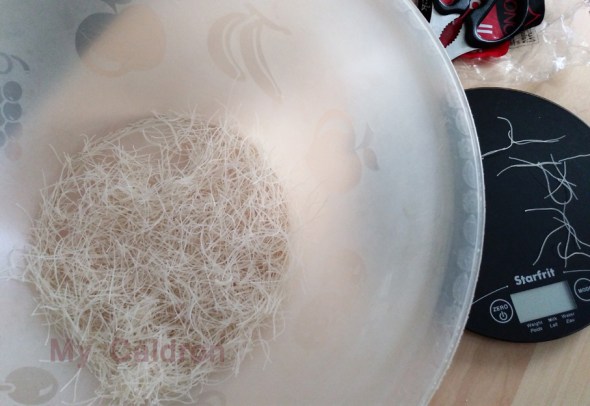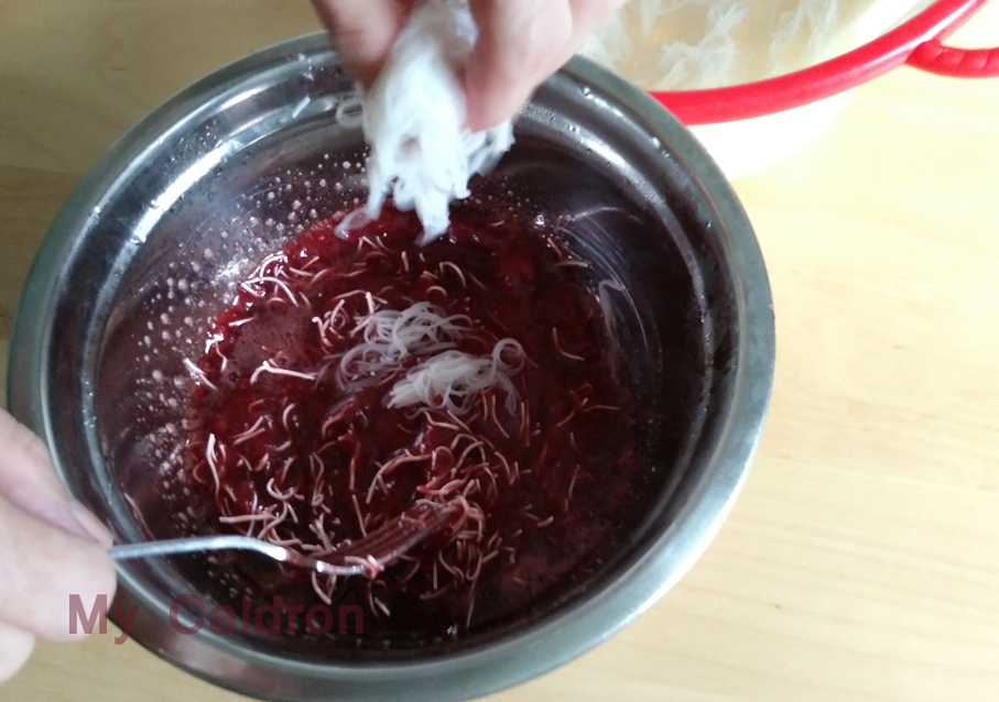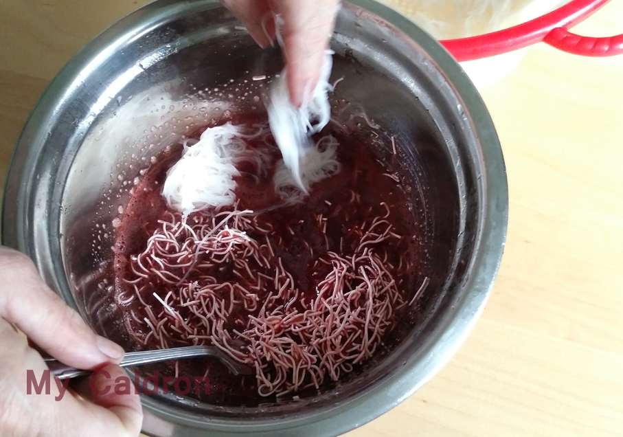 In the absence of the skills and resources necessary to make an original faloodeh with cornstarch, the Iranian expats have developed this simple yet quite genuine method to duplicate this delicious dessert by replacing packaged Chinese rice noodles with cornstarch. Now, a more delicious (and less known) version of white plain faloodeh is pomegranate faloodeh in which pomegranate juice is simply replaced with water. I have come up with the following recipe after trying many plain faloodeh recipes on the internet and modifying both the amount of ingredients suggested in these recipe as well as the method employed.