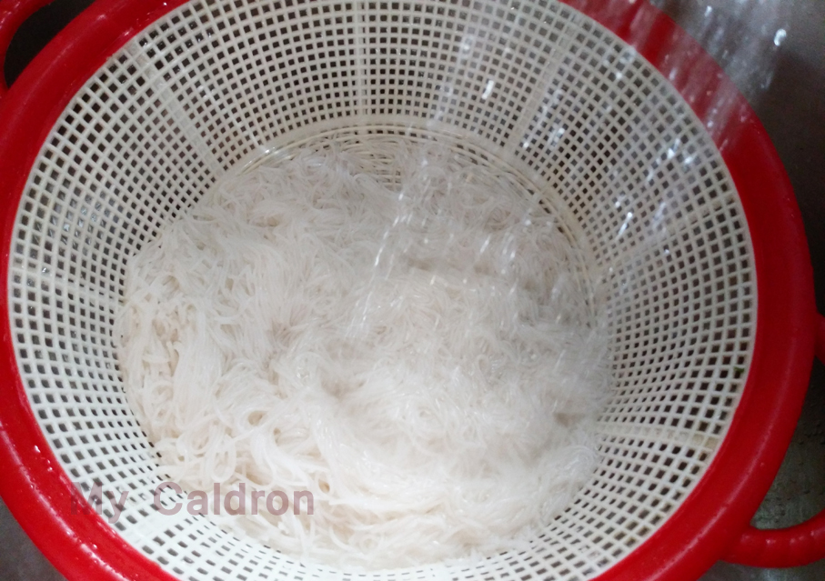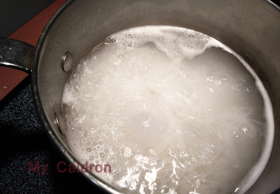 In the same pot you used to make liquid mix, pour in 3-4 cups of water and bring to a boil. Add in the noodles and let it boil for 10-15 minutes (although the rice noodles we are using are most pre-cooked we do need to further cook them).