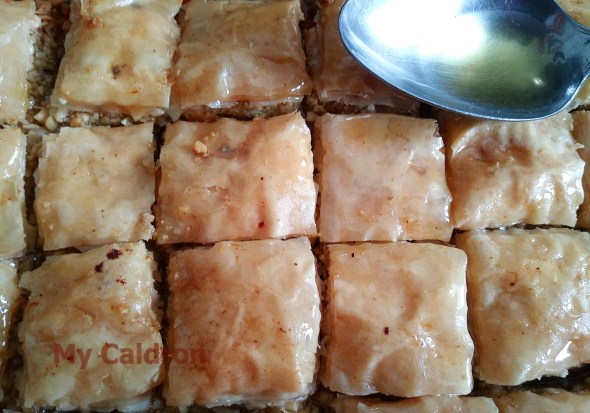 This year I decided to try my hands on a rather complicated homemade sweet, called baghlava, باقلوا in Persian – an extremely delicious walnut-almond rich layers brought together by fragrant honey-rosewater syrup.