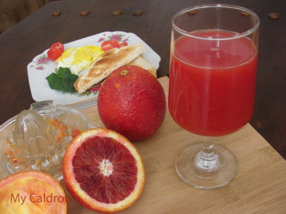 Posted: 5 March 2014 Filed under: Beverages, Blood Orange, Uncategorized Leave a commentBlood orange is a variety of orange with crimson, almost blood-colored flesh and smaller than average orange, with pigmented, though and hard skin. When completely ripened, they are juicy and sweet and definitely awesome looking in salads, salsas. They are also excellent for garnish in ice cream, in fruit salads and in sweet cocktails. I love having blood orange fresh out of my hand or better still, for treating myself with a glass of its juice to go with my savory sunny side up egg on a wintry and otherwise gray Sunday! One blood orange juice mixed with two regular orange gives a full l glass of orange juice which is still quite blood-colored, as you see in the picture.