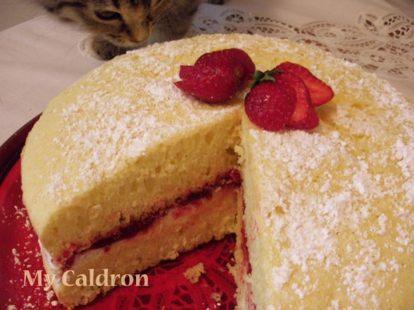 Posted: 28 August 2015 Filed under: Sponge Cake with Strawberry & Cream, Uncategorized | Tags: cream, no-butter, sponge cake, strawberry Leave a commentThis is another tempting recipe I tried from my friend’s blog, Saloomeh’s Kitchen, when I suddenly tumbled over my own cake-baking passion last year! – Sponge Cake layered, cleverly, with strawberry jam and cream. I got it only at the third go, though as it proved to be a delicate cake requiring extra gentle care and attention.