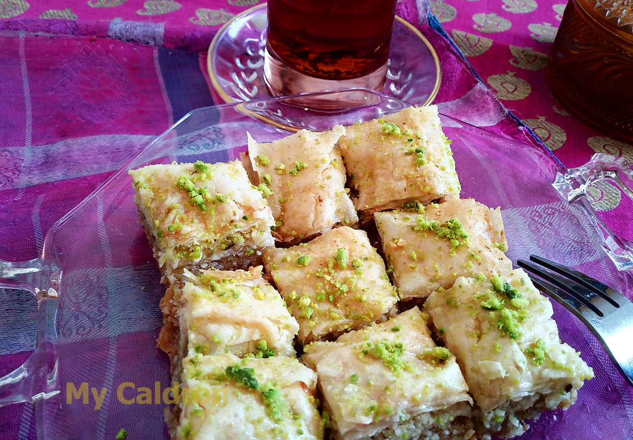 This year I decided to try my hands on a rather complicated homemade sweet, called baghlava, باقلوا in Persian – an extremely delicious walnut-almond rich layers brought together by fragrant honey-rosewater syrup.