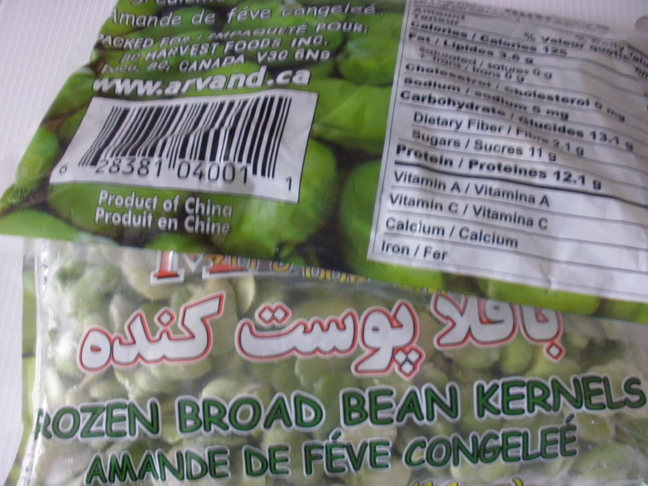 - Fresh or defrosted broad beans, shelled, skinned and split in two, 400gr. (never use canned broad beans! They are already too cooked, or too transformed in color and taste for this purpose. The picture shows what I easily find here in Montreal in the Middle Eastern supermarkets)