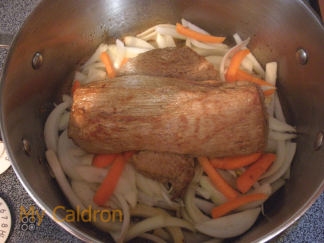 Method: In a medium size thick-bottomed pot, heat oil. Rob salt, pepper, and advieh all over meat’s chunks and brown each side for a few minutes over medium heat. Transfer the roasts into a platter. Add onions and garlic to the pan and cook for two minutes, then add carrots on the top. Sit the roast on top of onions and carrot. Turn the heat to minimum, cover with a tight lid and slow cook for at least two hours. You will not need to add any water at all! The roast will release its liquid and cooks itself at the core in the water produced by onions and carrots. You will see that at the end of cooking process (two hours or so) you will get a thick tasty broth and an extremely tender and savory roast meat.