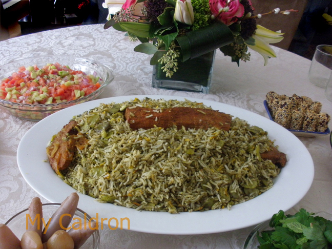 2) Just before you judge the grains to have been cooked at the core and ready to go to the colander, add the board beans as well. They should not cook in the water more than a couple of minutes though or will go mushy. Drain rice (now mixed with broad beans) in a fine meshed colander. Do so a bit earlier than you normally would. Once in colander, add the dried and fresh dill and shake the colander hard a few times (do not stir). Prepare the pot’s bottom with oil and bread or rice for tahdig, mound the mixture of rice, dill, beans back to the pot. Sprinkle a pinch of saffron and 2 tbsp. of broth (from your pot roast) and cover the pot with the lid. When you notice steams building inside the pot, wrap the lid in a clean kitchen cloth and put it back on. Allow at least one hour for the mixed polow to steam cook.