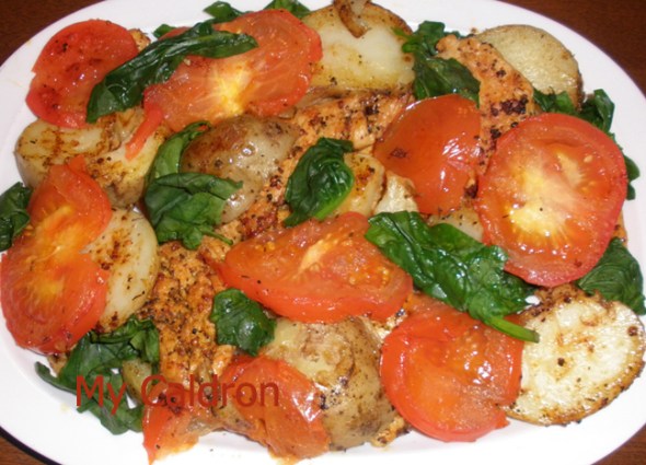 Ingredients (two servings): Skinless, boneless chicken breast, half, cut in a few large pieces, washed and patted dry. Potatoes, 2 medium (leave skin on). Tomatoes, 2 medium. Spinach, 3-4 leaves. Bread crumbs of your choice, 4 tbsp. Olive oil, 3 tbsp. For dressing : Onion, 1, cut in small cubes. Lime juice, 1 tbsp. Salt and pepper, a pinch each. Olive oil, 1 tbsp. Read the rest of this entry »