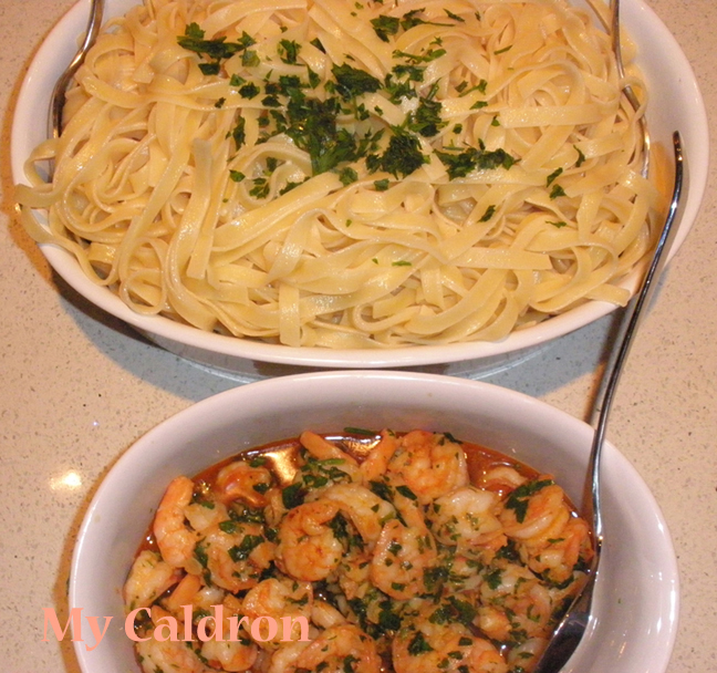 Ingredients :Fettuccine pasta, 500 gr. Cooked shrimp – defrosted or fresh – peeled and deveined, 500 gr. Garlic 4 cloves, minced. Fresh parsley, 2 tbsp., chopped. Olive oil, 2 tbsp. Smoked Spanish paprika Powder (key ingredients, found in International section of most super markets), 1 tbsp. Salt and black pepper to taste.