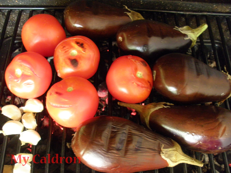 Method: Grill pierced eggplants and whole tomatoes on a barbecue grill – ideally on charcoal, till skin is burned and inside is well cooked. Obviously eggplants require more cooking time. Cut off the two ends of garlic cloves and place them on the barbecue grill with the skin on and grill them for a few minutes as well. Remove your vegetables, as they are sufficiently cooked and set aside to cool. Note that it is customary to grill and “smoke” the eggplants, but I have figured smoking tomatoes add to the delicious taste of Mirza ghasemi. My friend has discovered and kindly tipped me preparing garlic the way I just mentioned is magical! It truly is, you just have to be careful not to burn it. And while you are at it, make lots of smoked garlic and use them in your jar of olive oil along with fresh herbs and red chili pepper.