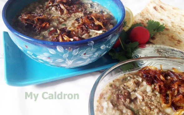 Method: In a medium pot sauté onions in hot oil. Add meat and bone and turmeric and fry for a few more minutes over medium heat, just as you would for any type of Iranian style stew. Add salt, pepper and six cups of water (bout 1 ½ liters). Cook covered, for about 45 minutes. Remove the bone from the broth and let it cool; Extract the bone marrow and pick the meat off the bone, if any, and transfer them back to the pot. Rinse lentil and add it to the broth and cook until tender.
